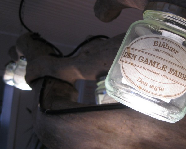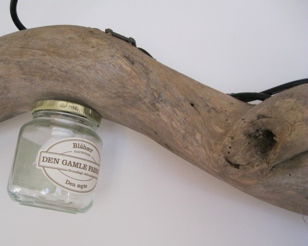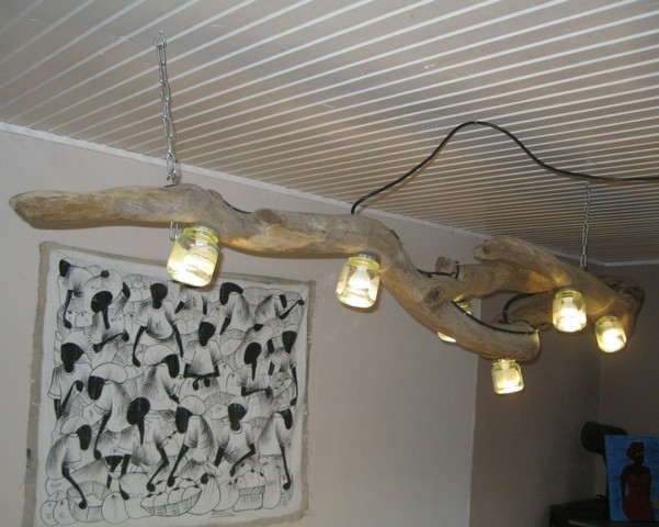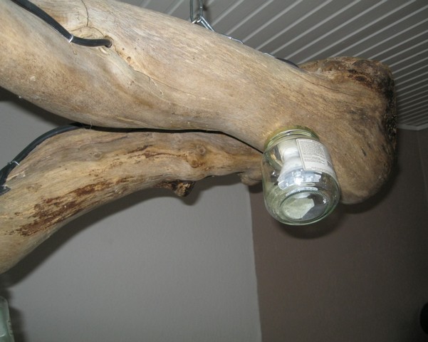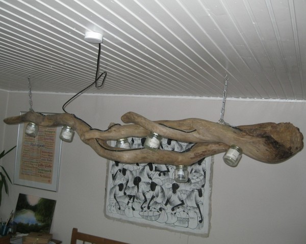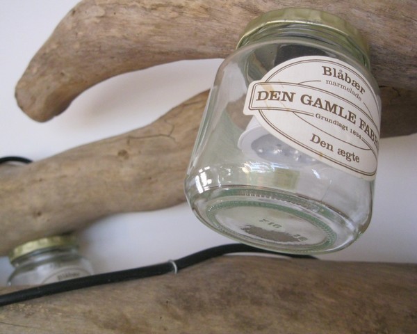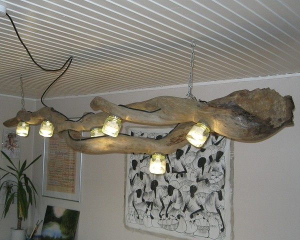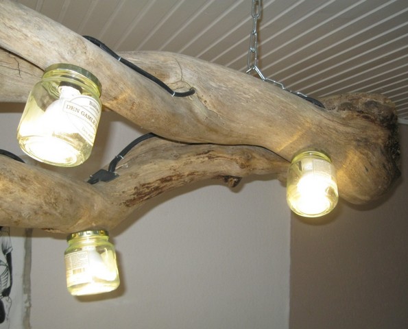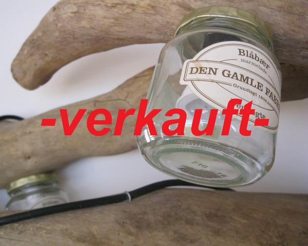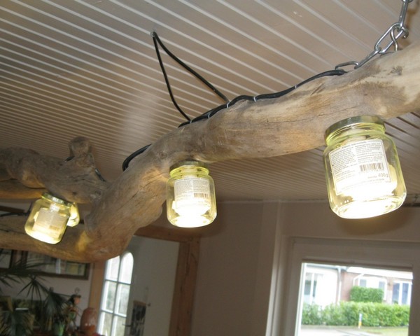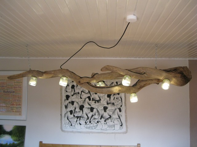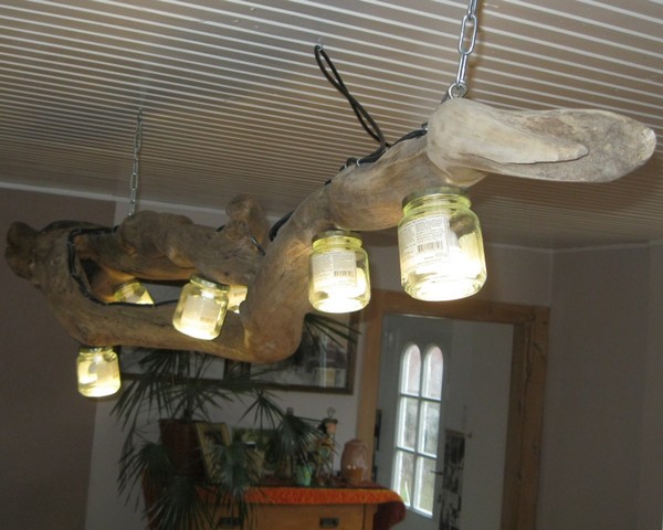 Hängelampe Holz klarlackiert, mit 6 Spots, mit G10 Keramikfassung eingebaut in dänische Marmeladengläser.