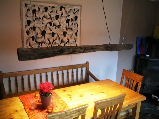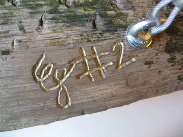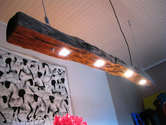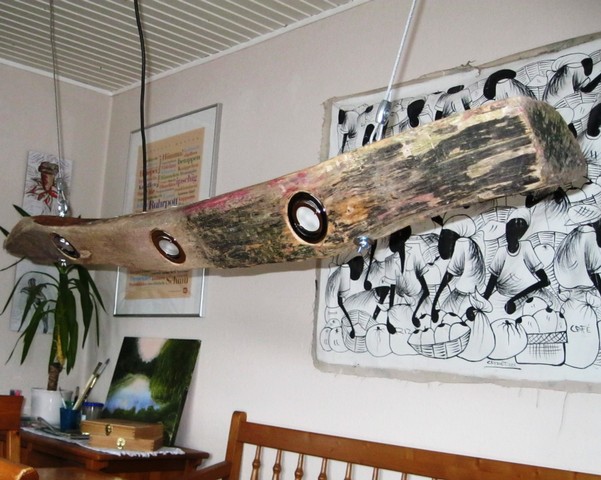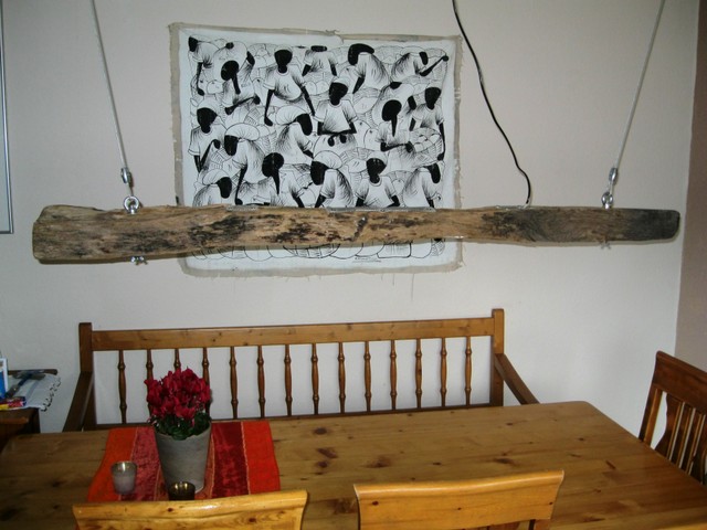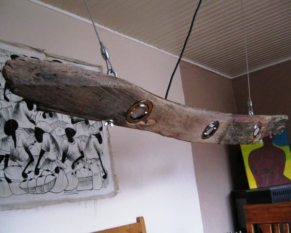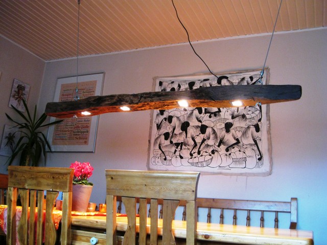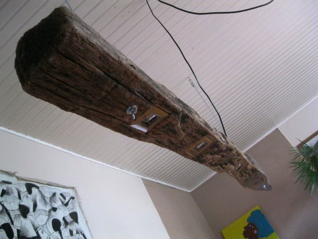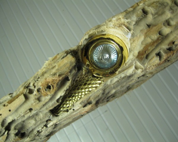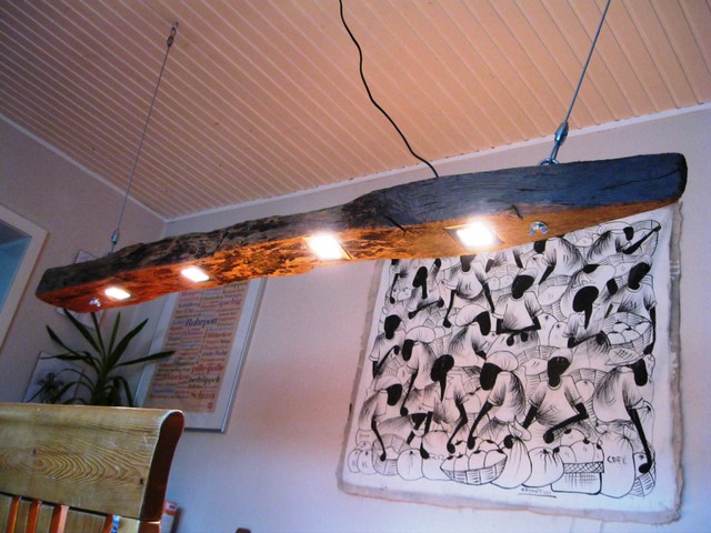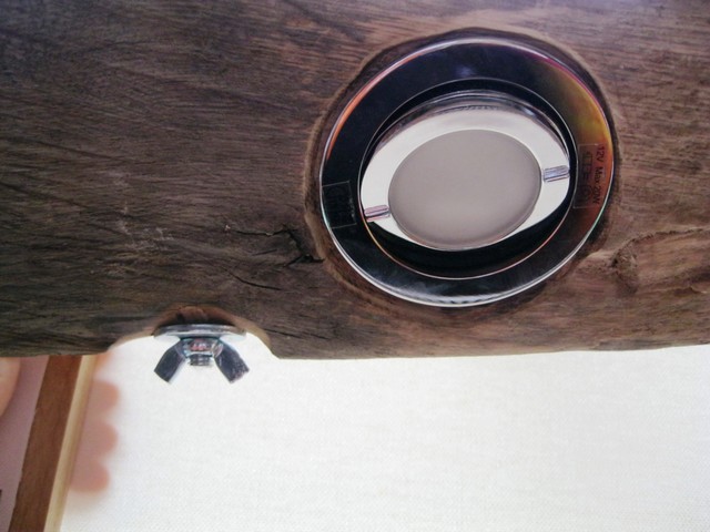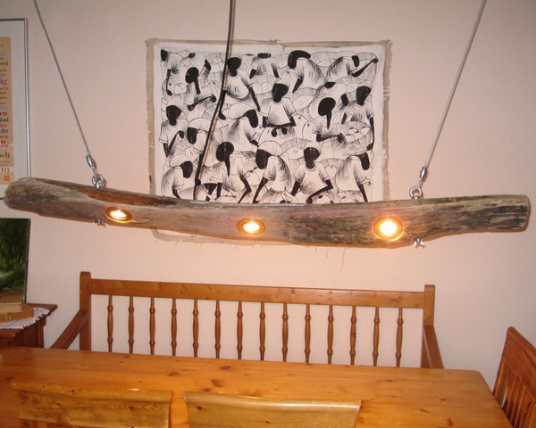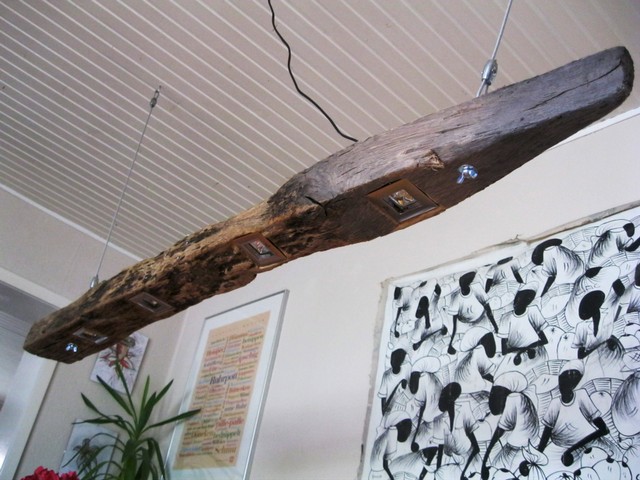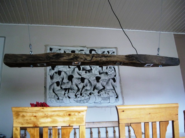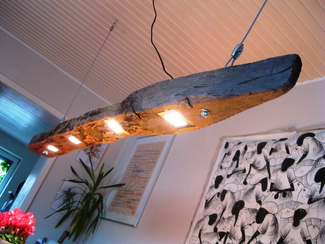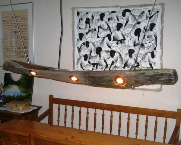 Hängelampe Pfosten roh und unbehandelt, mit 3 Paulmann Einbauleuchten Premium-Line Alu-Zink Gold. Aufhängung über zwei transparente Angelschnüre, dadurch wirkt es, als schwebe sie im Raum. (Paulmann Artikel: 993.18, Leuchtmittel: 3 x 20 Watt, Spannung: 230V/12V, Trafoleistung: 105 VA, Sockel: GU4, Energieeffizienz: C, Technik: 12 Volt Halogen/Umbau auf LED möglich)