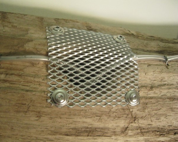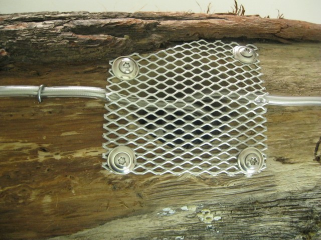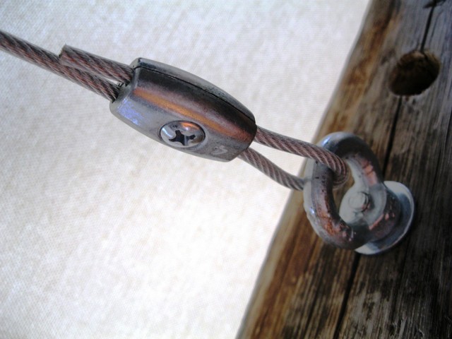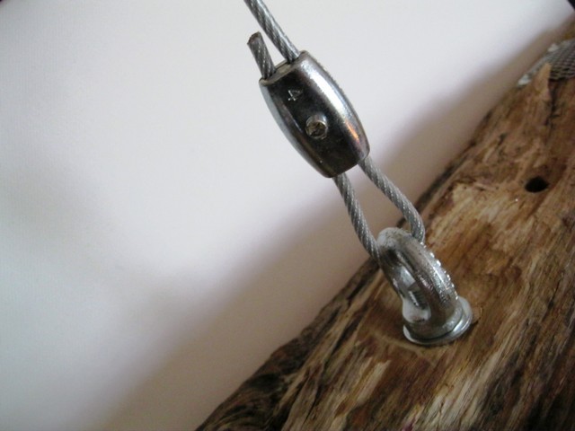 Hängelampe Holzpfahl vierkant roh und unbehandelt, mit 4 Paulmann Einbauspots Quadro Eisen gebürstet. Variable Aufhängung über zwei ummantelte Stahlseile mit Seilklemmen. (Paulmann Artikel: 995.72, Leuchtmittel: 4 x 35 Watt, Spannung: 230V/12V, Trafoleistung: 150 VA, Sockel: GU5,3, Energieeffizienz: C, Technik: 12 Volt Halogen/Umbau auf LED möglich.)