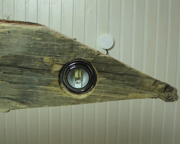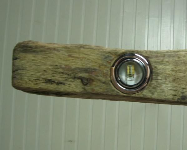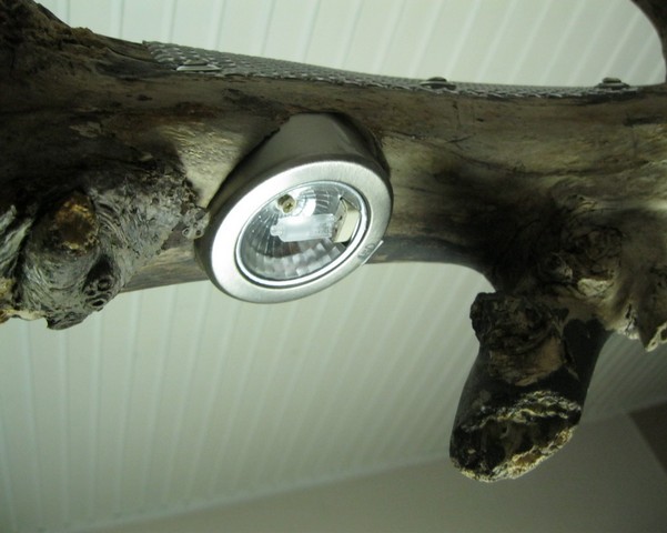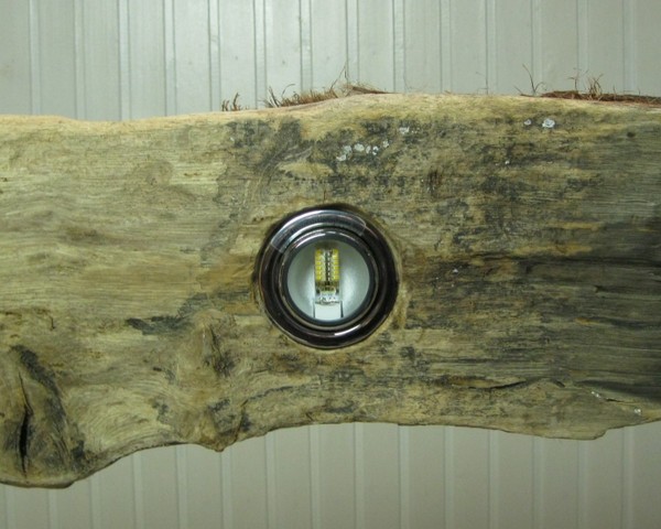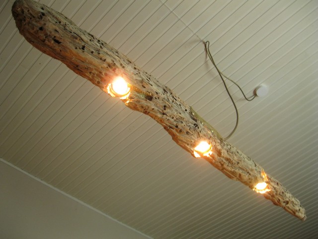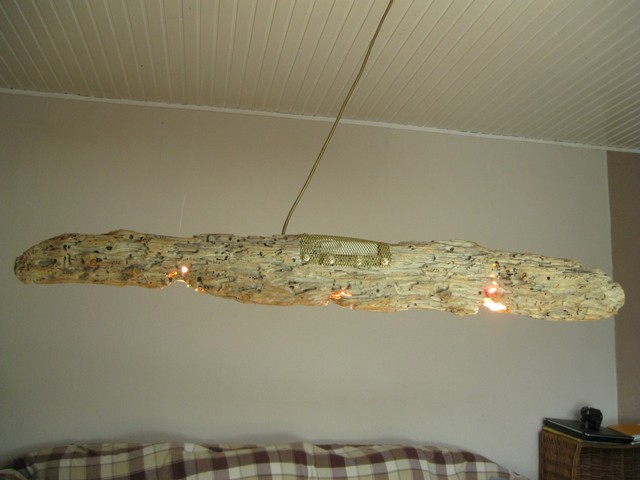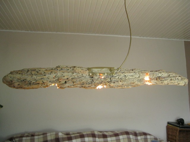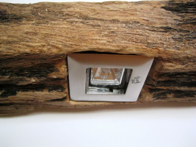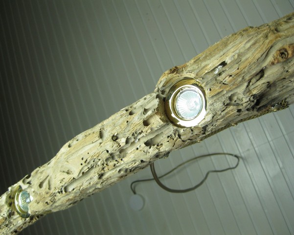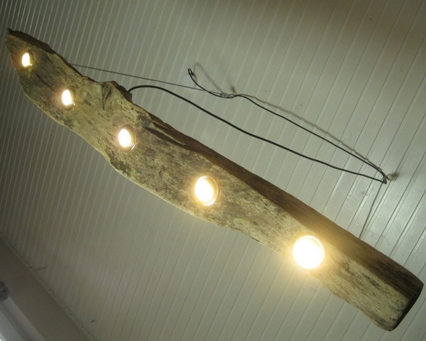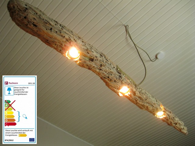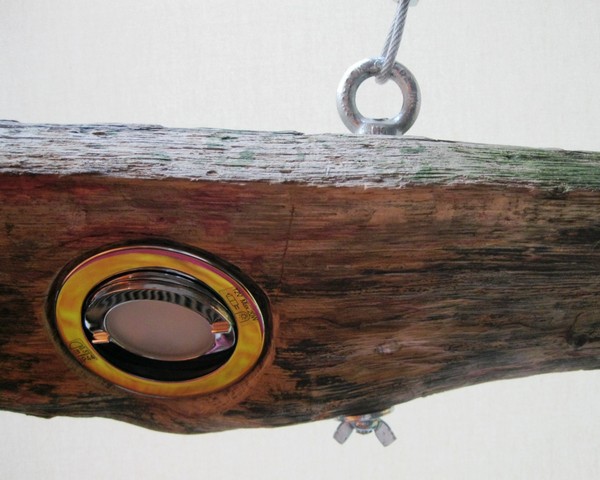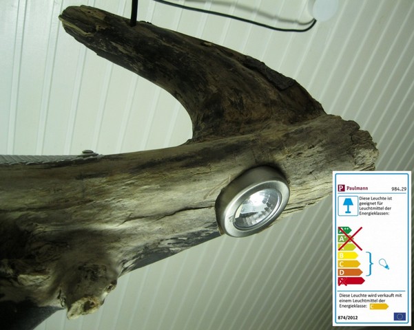 Hängelampe Holzpfahl roh und unbehandelt, mit 6 Paulmann Einbauspots Downlight chrom. Variable Aufhängung über zwei ummantelte Stahlseile mit Seilklemmen. (Paulmann Artikel: 985.73, Leuchtmittel: 6 x 10 Watt, Spannung: 230V/12V, Trafoleistung: 60 VA,  Sockel: G4, Energieeffizienz: C, Technik: 12 Volt Halogen/Umbau auf LED möglich.)