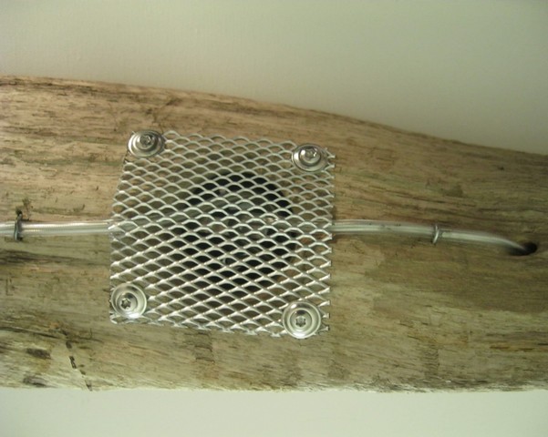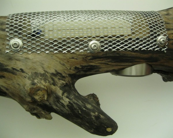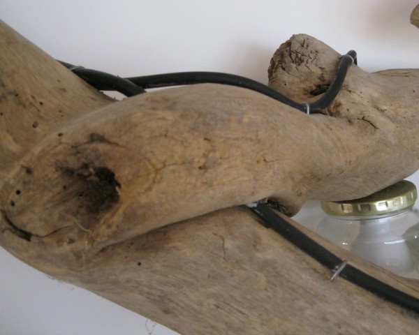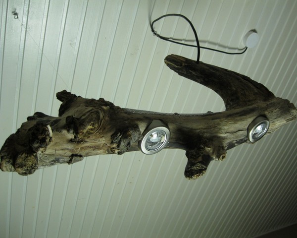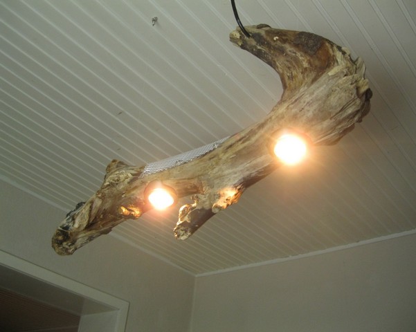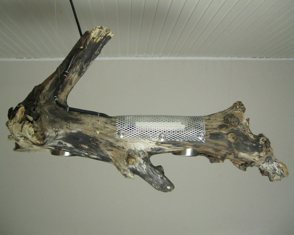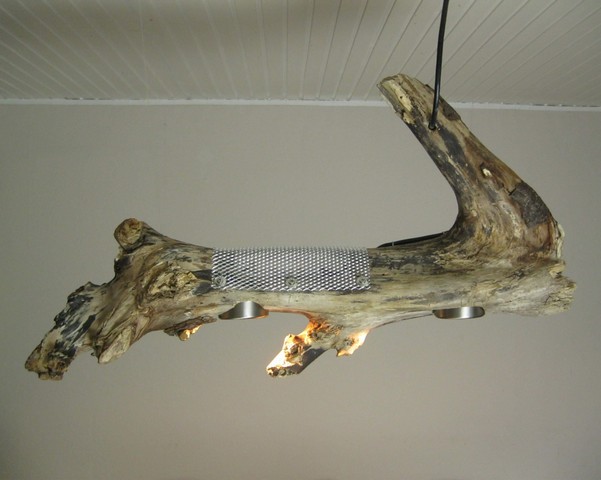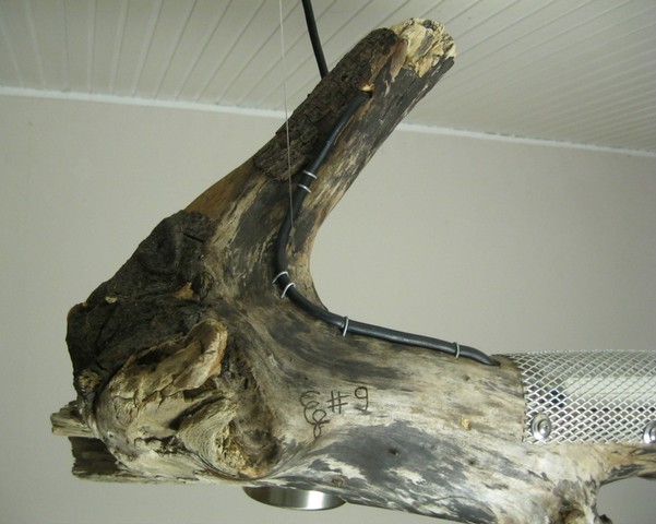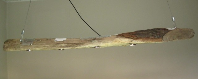 Hängelampe Aststück roh und unbehandelt, mit 2 Paulmann Einbauleuchten Micro-Line Eisen gebürstet. Aufhängung über zwei transparente Angelschnüre, dadurch wirkt es, als schwebe sie im Raum. (Paulmann Artikel: 831.17, Leuchtmittel: 2 x 20 Watt, Spannung: 230V/12V, Trafoleistung: 60 VA, Sockel: GU4, Energieeffizienz: C, Technik: 12 Volt Halogen/Umbau auf LED möglich)